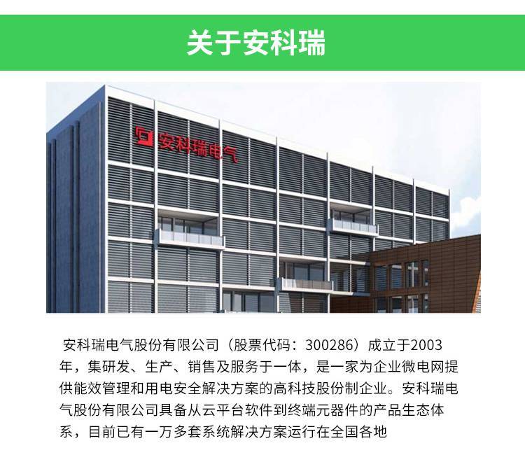 | 公司简介 | 公司简介安科瑞电气股份有限公司成立于2003年,2012年在创业板上市,股票代码:300286。公司总部位于上海嘉定,是一家为企业提供微电网能效管理和用能安全提供解决方案的高新技术企业和软件企业,取得过各类专利及软件著作权700多项(截止到2023年12月31日)。安科瑞现有研发工程技术人才500多人,聚焦用户侧能效系统和能源互联网,具备从云平台软件到终端元器件的一站式服务能力,形成了“云-边-端 ... | ||