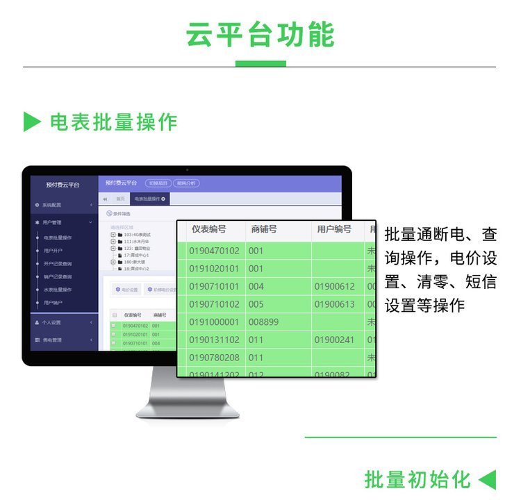 水电预付费云平台帮助转供电主体向租户收取电费和水费,包括远程抄表、费用统计、损耗公摊、公耗 公摊、财务报表等,协助转供电主体更高效的解决电费水费收取难题。水电预付费云平台主要包含预付费电 表、阀控水表、智能网关和计费管理软件组成。系统主要完成费控电表/水表参数设置,商户售电/售水管理、 损耗分摊及能耗统计工作,适用于商业广场、学生公寓、工业园区和办公室楼宇等。