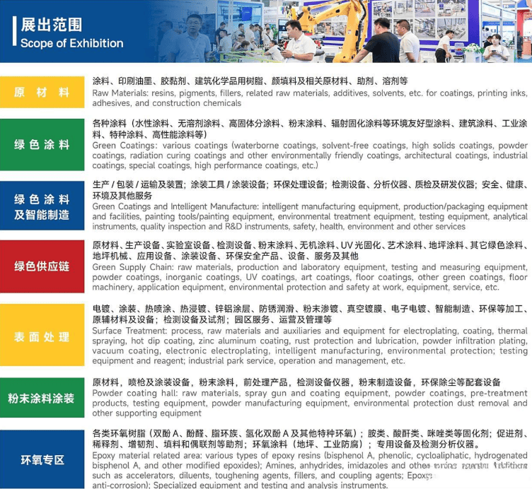 主题聚焦:展会紧扣行业热点,围绕“绿色环保”“智能制造”“新材料应用”三大核心议题展开。水性涂料、粉末涂料等环保产品将成主角,智能调色系统、自动化喷涂设备等数字化解决方案也将惊艳亮相。