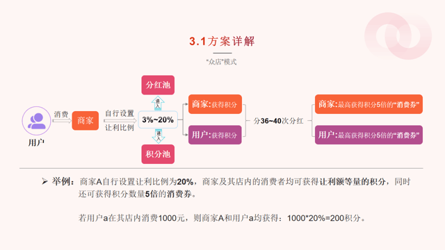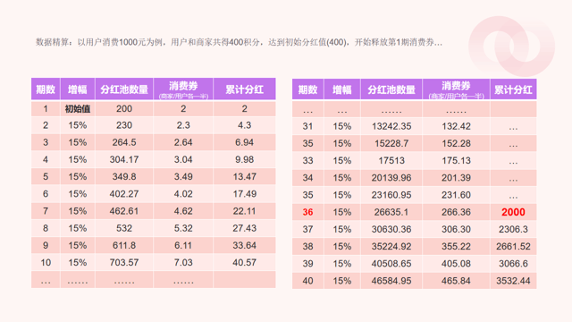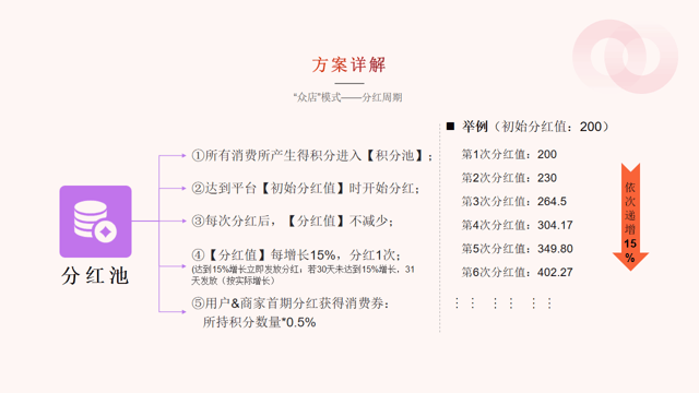 “”之前的玩法挺实在:用户消费后攒积分,36-40期慢慢增值成5倍抵用券;积分池涨15%才分红,首期按0.5%发券。