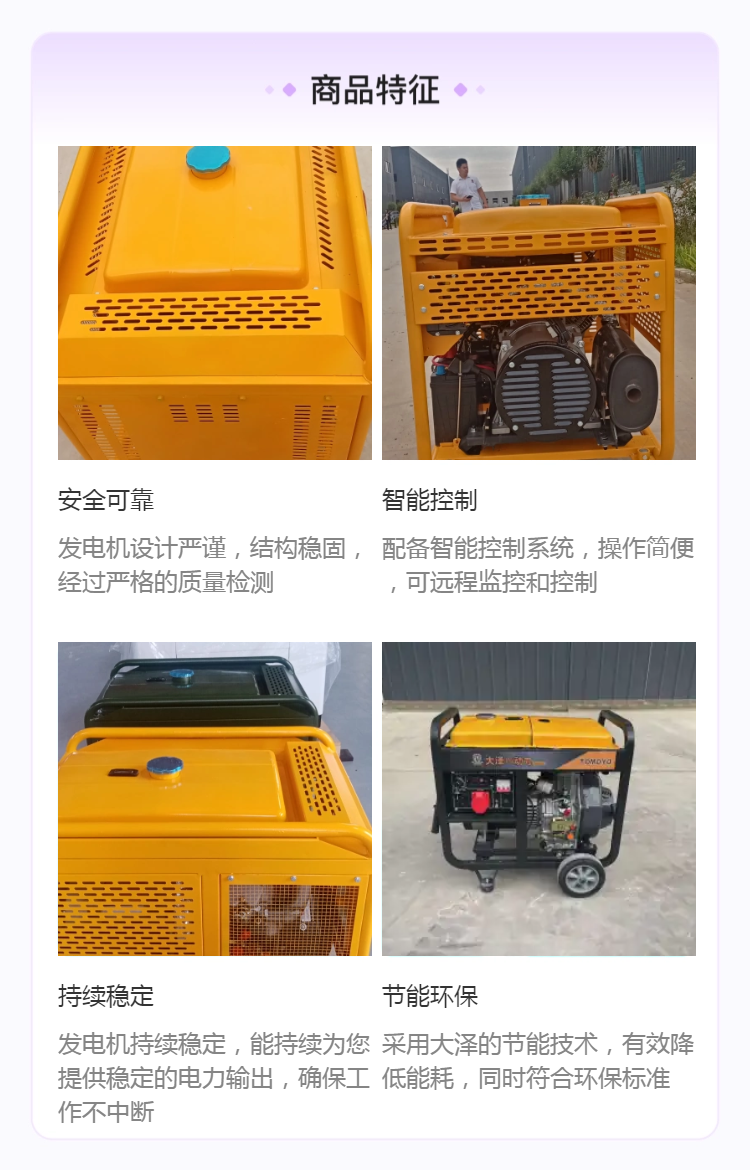 作为大泽动力旗下的精品机型,TO8000ETZ代表了企业多年研发积累的结晶。8kw柴油发电机采用先进的发动机核心技术,不仅保证了强劲的动力输出,还优化了燃油效率,确保长时间运行经济环保。大泽动力品牌在行业内享有良好声誉,研发团队持续优化产品性能,使得TO8000ETZ具备更强的负载适应能力和稳定性。