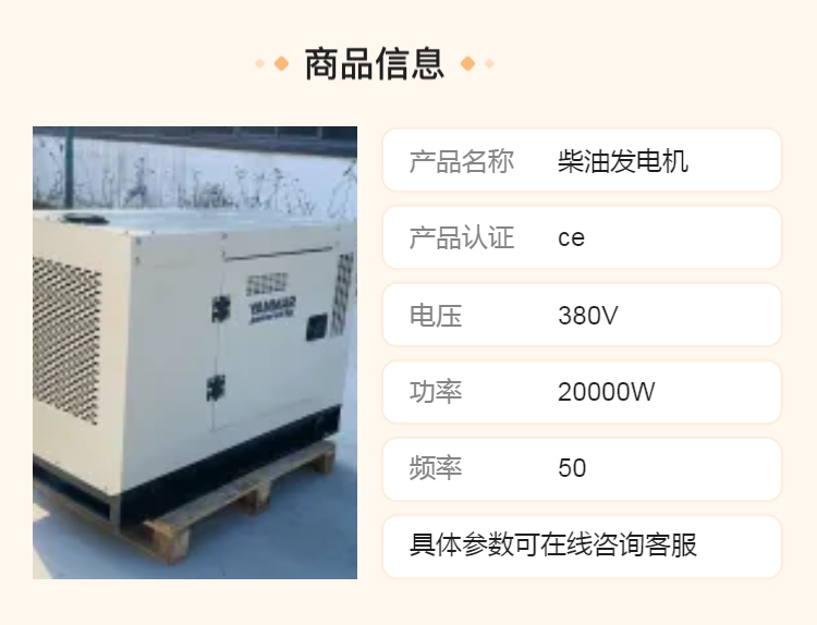 20kw的功率在工业、建筑工地、小型工厂以及大型户外活动中都能满足基本的电力需求。相比小功率发电机,它能稳定供应更多的电量,兼顾了功率与便携性的平衡。其输出电压为380V三相电源,符合工业用电标准,确保设备安全稳定运行,避免因电压不稳引发的设备故障。