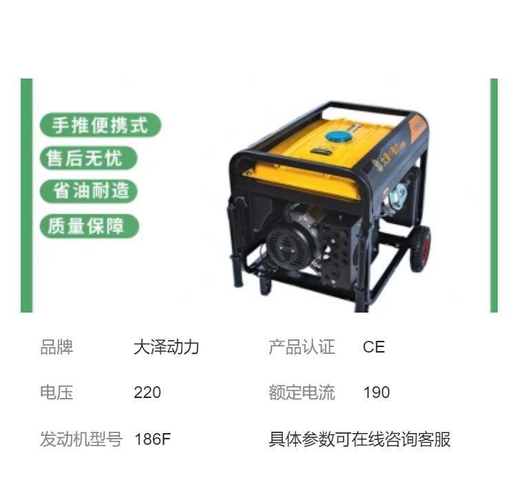 来看,作为一款性能稳定、认证齐全且使用便捷的12000W汽油机,大泽动力186F汽油发电机以其出色的220V单三相输出,满足多样化工业用电需求。上海欧鲍实业有限公司的快速发货和完善服务,为用户提供无忧的购买体验。