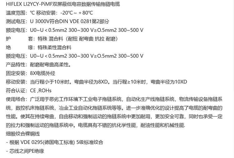 HIFLEX LI2YCY-PiMF双屏蔽低电容数据传输拖链电缆不仅凭借其双屏蔽优势和低电容特性保障了传输质量,更符合现代工业拖链动态工作的需求。它集稳定传输、耐用性、柔韧性于一体,尤其适合自动化和智能制造领域的高标准应用。6.00元每米的价格,体现了上海长柔电缆有限公司在保持高品质的努力为客户提供具有竞争力的价格。