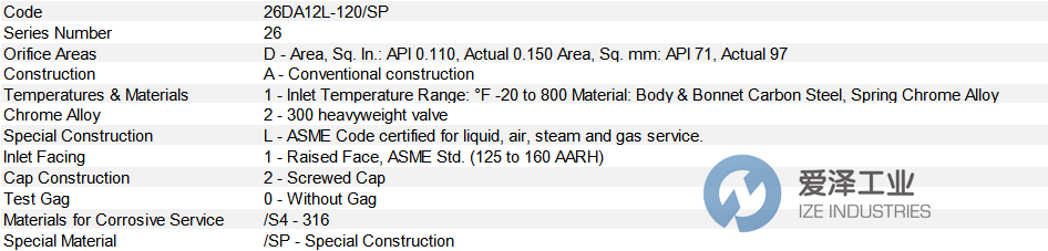 FARRIS泄压阀26DA12L-120/S4/SP技术参数