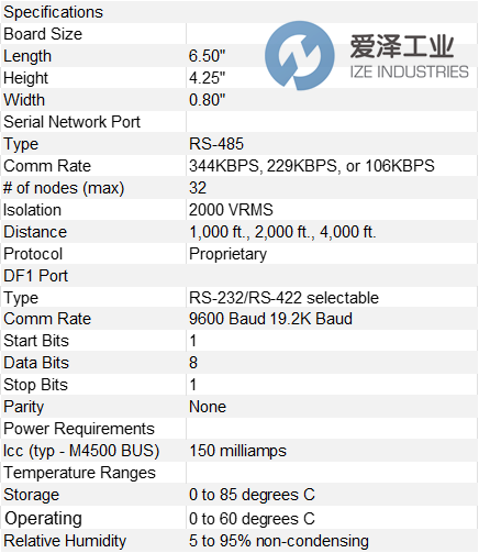 S4516-DF1板卡适用于M4500系列模块,包含一个S3000串行网络接口端口和一个RS-232/RS-422 DF1端口,该端口支持Allen-Bradley DF1串行通信协议。S4516-DF1板卡使M4500模块能够通过S3000串行网络与其他 S3000、M4000 或 M4500模块/处理器进行通信。RS-232/RS-422 DF1端口允许与 A-B PLC(例如 PLC-5、SLC500 等)或支持A-B DF1协议的设备进行通信。一台M4500中可以安装多个S4516-DF1板卡(安装数量不超过该型号的插槽数量),从而可以使用多个S3000网络端口或RS-232/RS-422 DF1端口。